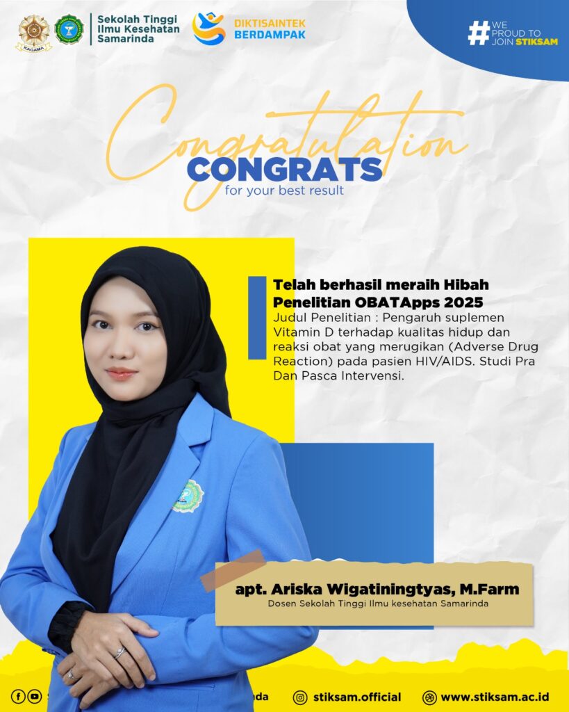 Samarinda, 8 Oktober 2025 – Kabar membanggakan datang dari Sekolah Tinggi Ilmu Kesehatan Samarinda (STIKSAM). Salah satu dosen STIKSAM berhasil meraih Hibah Penelitian Obat Apps Tahun 2025. Pencapaian ini menunjukkan komitmen dan jiwa inovasi yang tinggi dalam berkarya di ranah farmasi dan kesehatan.