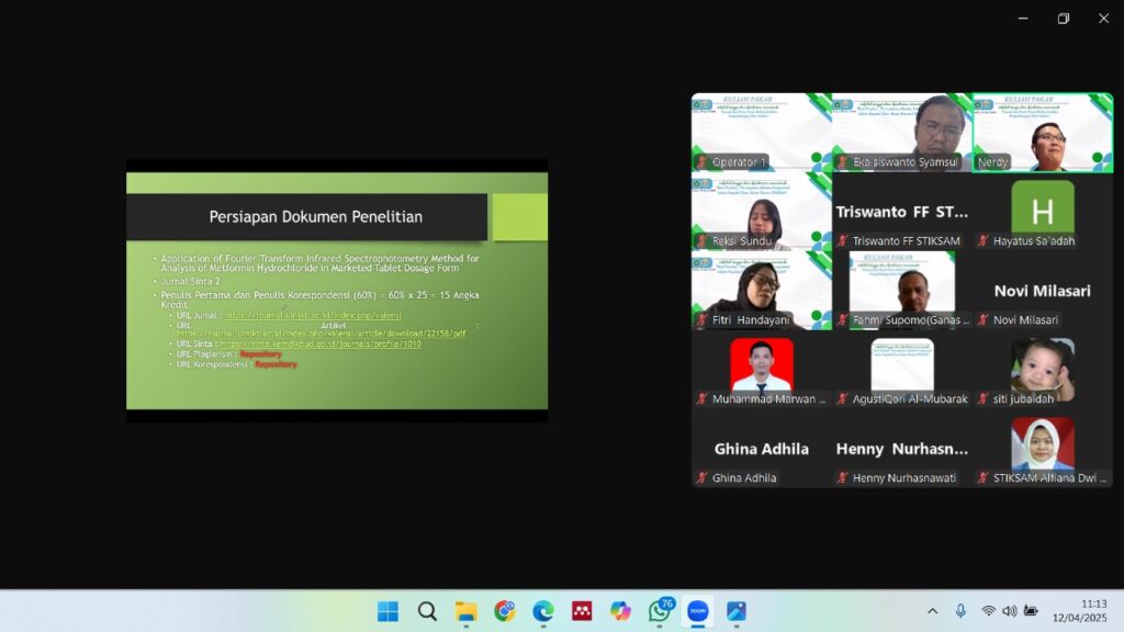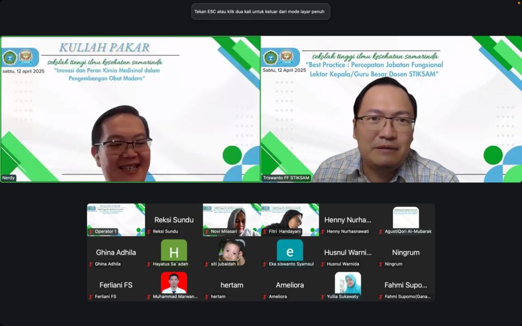Acara ini terbagi menjadi dua sesi yaitu sesi Kuliah Pakar yang bertemakan “INOVASI DAN PERAN KIMIA MEDISINAL DALAM PENGEMBANGAN OBAT MODERN” dan Sesi Best Practice yang bertemakan “PERCEPATAN JABATAN FUNGSIONAL LEKTOR KEPALA/GURU BESAR DOSEN STIKSAM”. Acara ini diselenggarakan pada hari Sabtu, 12 April 2025 dan dihadiri oleh Prof. Dr. apt. Nerdy, S.Farm., M.Si. sebagai pembicara di acara kuliah pakar dan Best Practice ini.