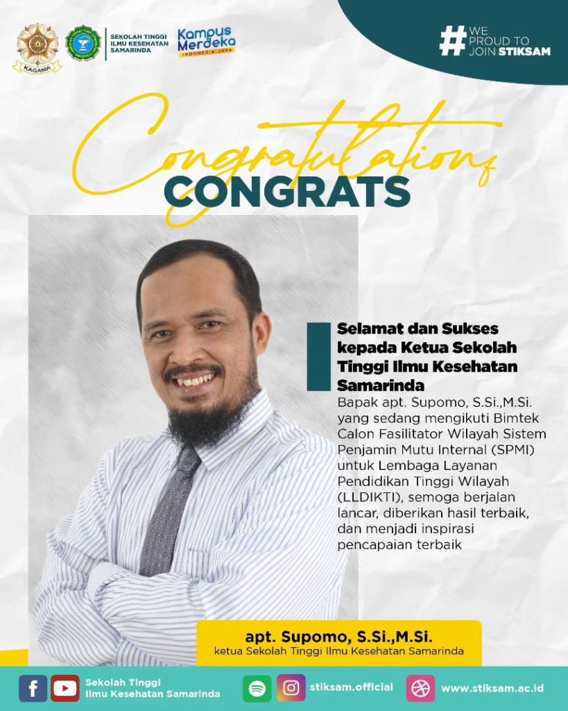 Selamat dan Sukses kepada Bapak apt. Supomo, S.Si.,M.Si. (Ketua STIKSAM) yang sedang mengikuti Bimtek Calon Fasilitator Wilayah Sistem Penjamin Mutu Internal (SPMI) untuk LLDIKTI, semoga berjalan lancar, diberikan hasil terbaik, dan menjadi inspirasi pencapaian terbaik