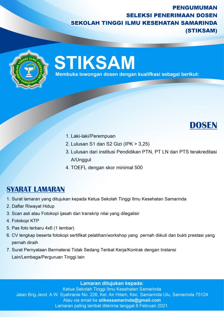 SELEKSI PENERIMAAN DOSEN Post author:admin Post published:25 January 2021 Post category:Pengumuman You Might Also Like Pengumuman Peserta Yang Lulus PMDP 10 April 2017 Informasi Tenaga Pendidik Yang Sudah Tidak Bekerja di STIKES Samarinda (ex AKFARSAM) 06 September 2019 PENGUMUMAN PELAKSANAAN PENGENALAN KEHIDUPAN KAMPUS BAGI MAHASISWA BARU (PKKMB) 22 August 2017